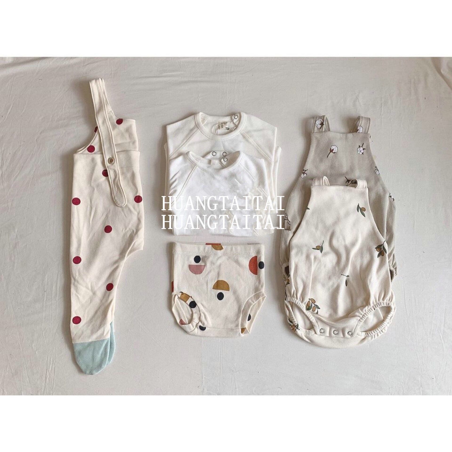 色:コットンビブ+ハット,オリーブブランチサロペット+帽子,濃い赤のドットのオーバーオール+帽子,青いボトミングシャツ,パープルボトミングシャツ,ダークオレンジのベースシャツ