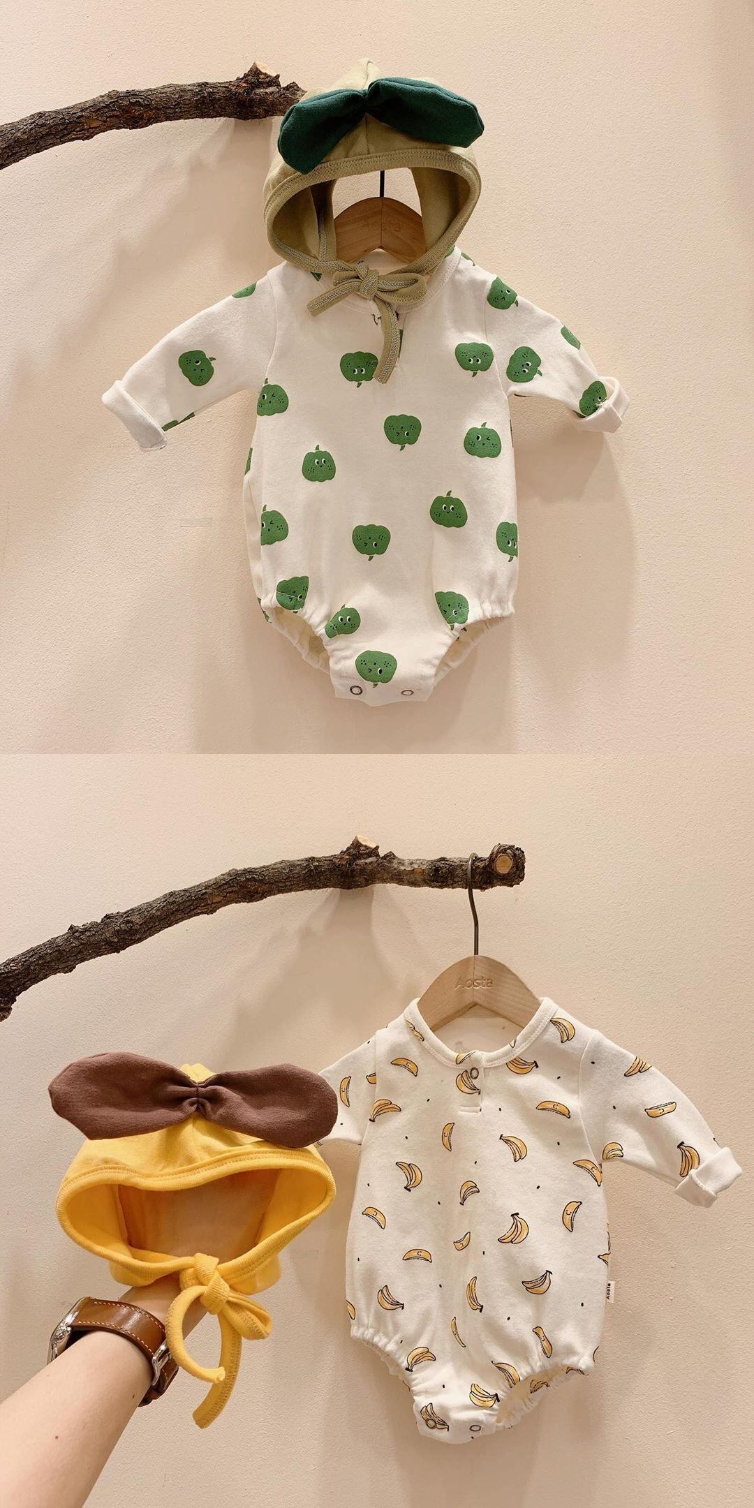 2点セット 長袖 ロンパース 帽子 フルーツ ロング 緑 黄 赤 コットン ガーリー スウィート キュート カジュアル オータム 秋物 mi5310387526131