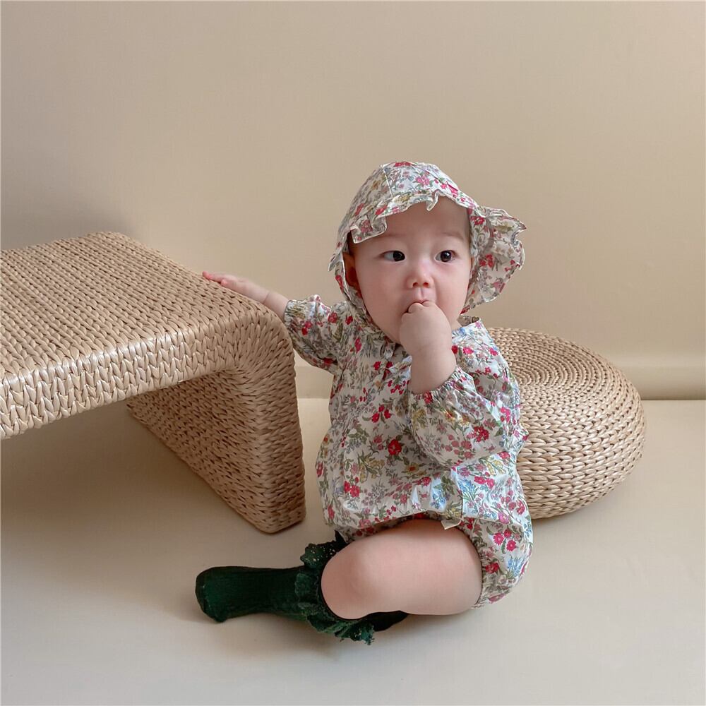 フローラルプリント柄オーバーオール オータムジャンプスーツ オールインワン セット 帽子 秋物 花柄 mi5369347345415