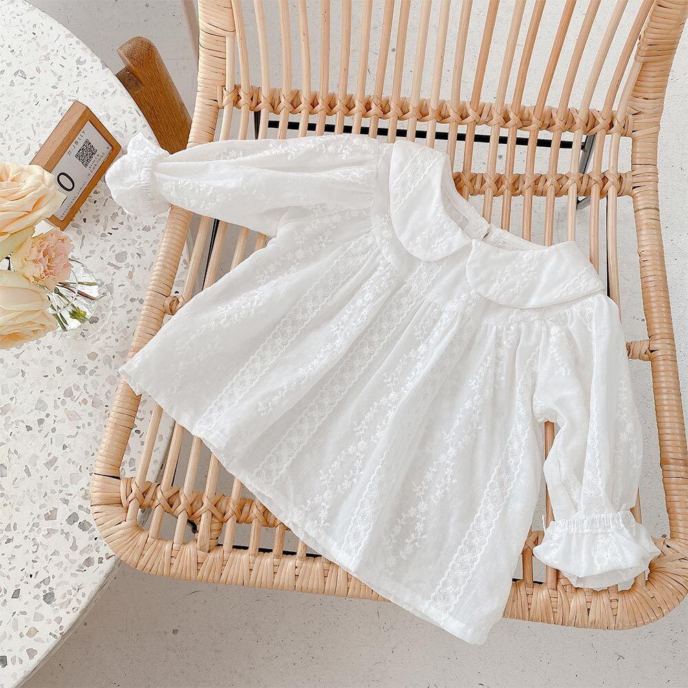 スプリングオータムホワイトレースFlowerデザイン シャツカラー長袖スリーブブラウス トップス ロング 春物 秋物 Tシャツ フラワーデザイン mi538376356322