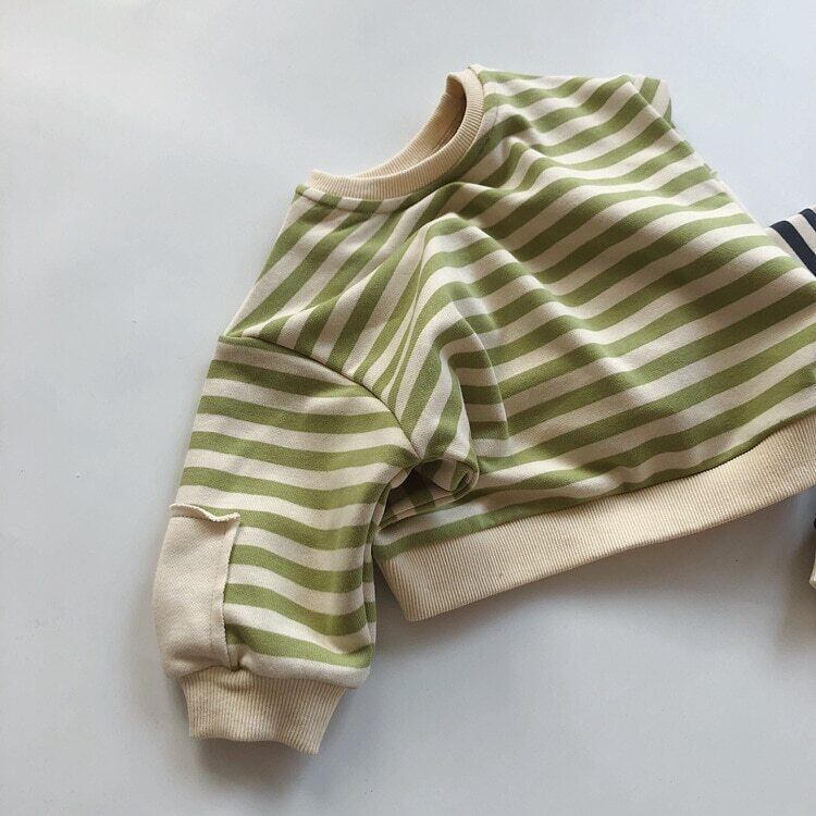 スプリングストライプスウェット ルーズOネック長袖スリーブプルオーバー トップス ロング シャツ 春物 キッズ mi5338156782721