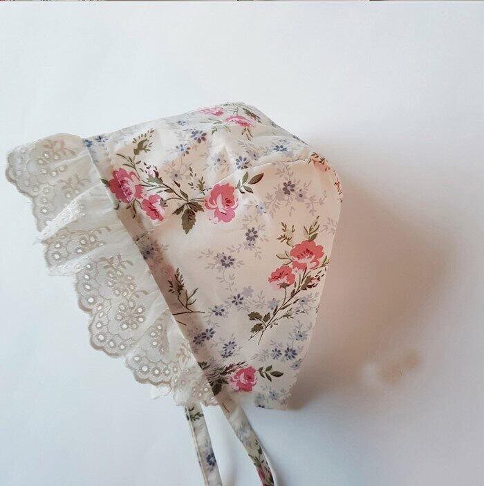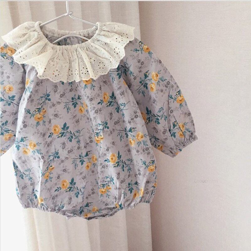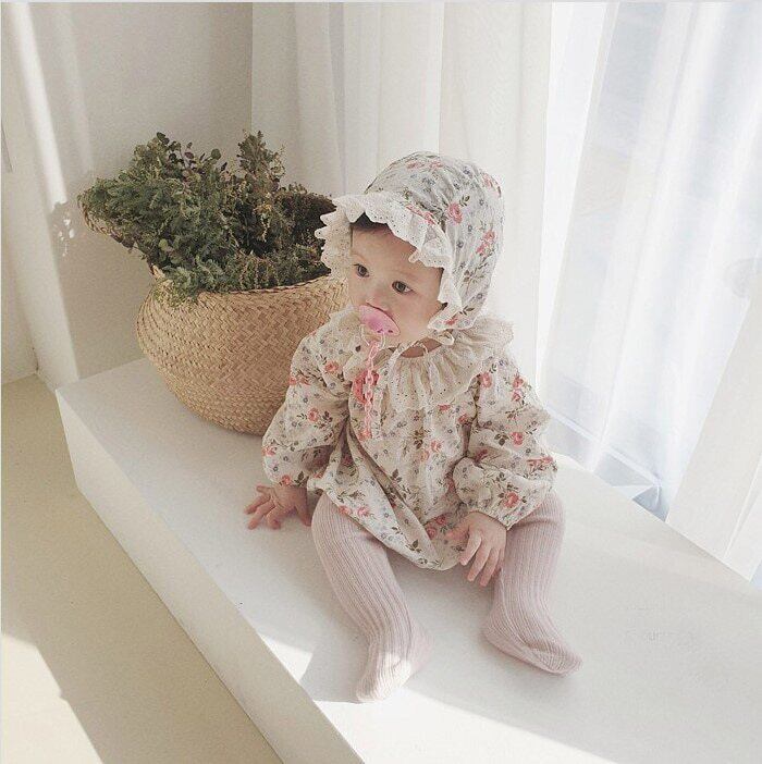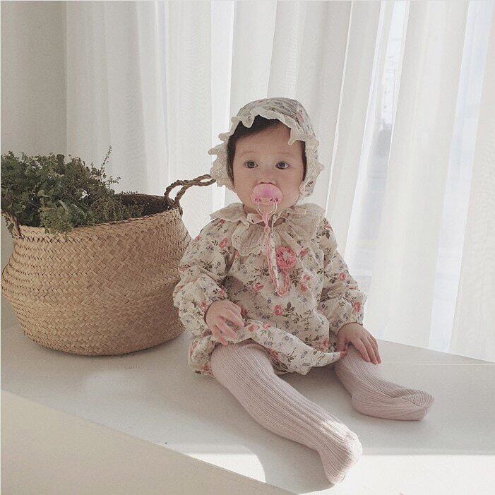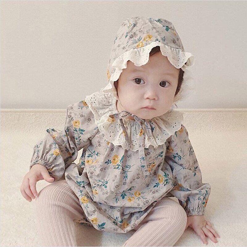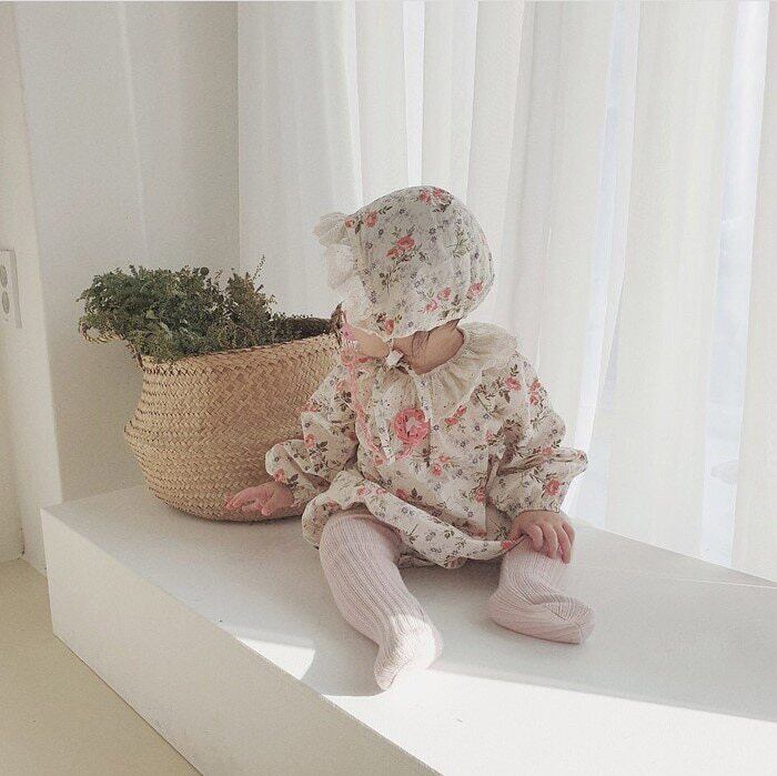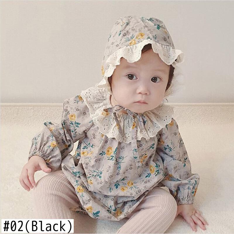 オータムフローラル長袖スリーブジャンプスーツ オールインワン レースカラー ロング コットン 帽子 秋物 花柄 mi5396693422485
