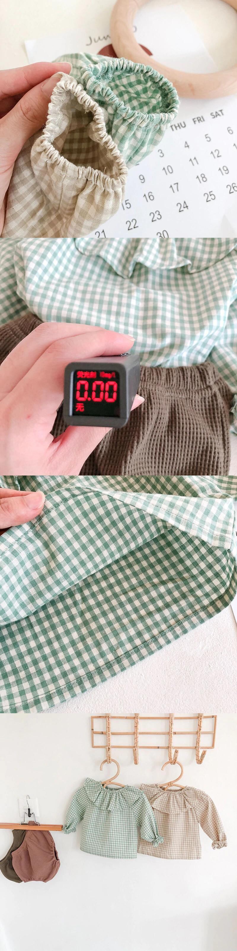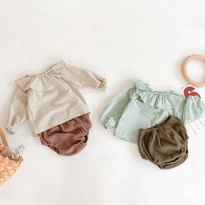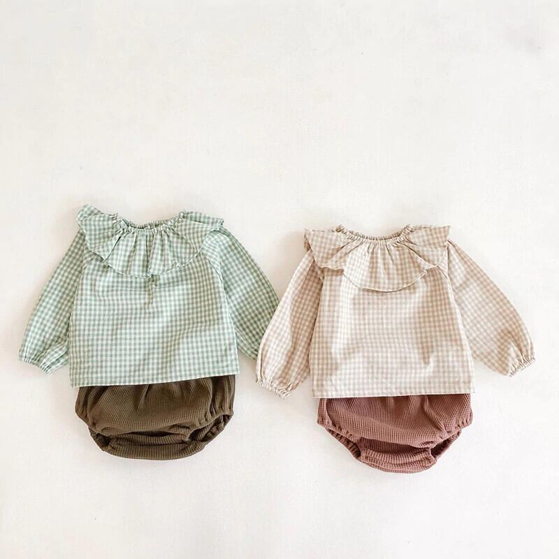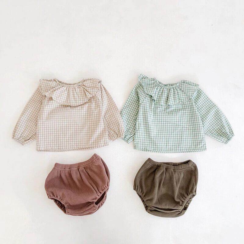セット ラッフルカラー格子柄ブラウス ショーツ ブルマー mi5324666727919