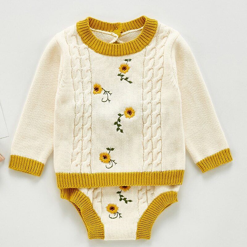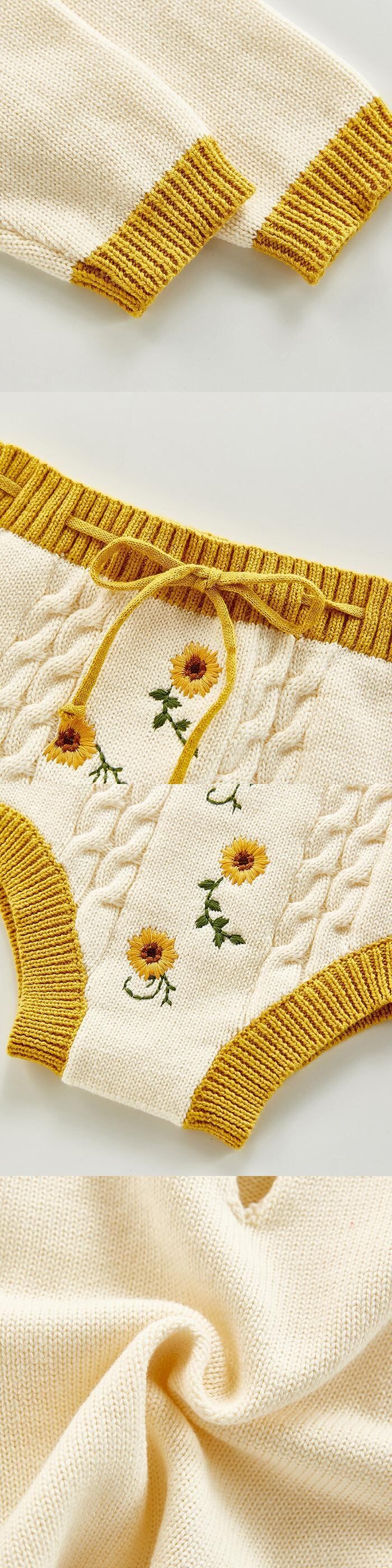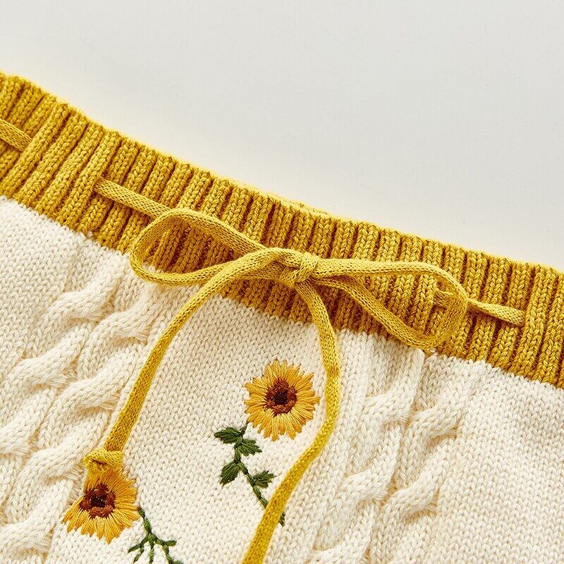 オータムFlowerデザイン 刺繍ニット 長袖スリーブショーツ ロング 秋物 ブルマー フラワーデザイン mi5382402653041