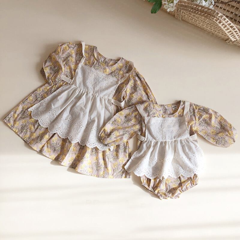 オータムフローラル長袖スリーブドレス ロンパース オールインワン ロング コットン 秋物 花柄 mi5379891918835