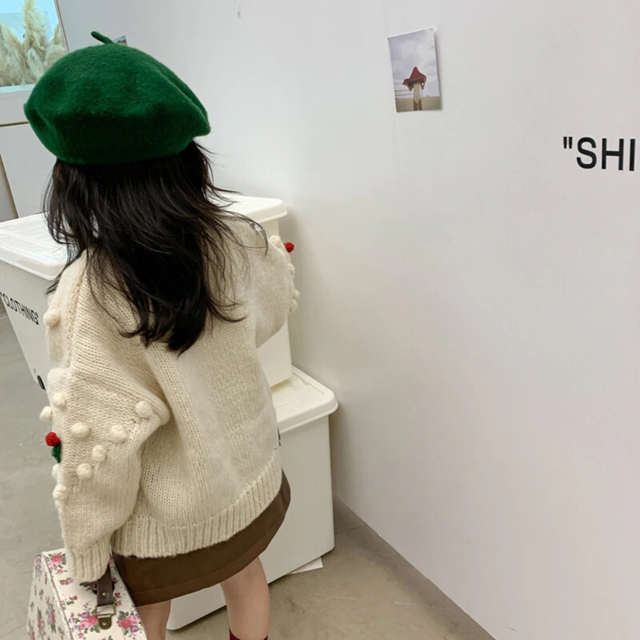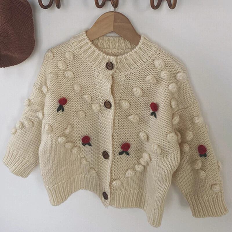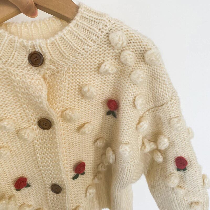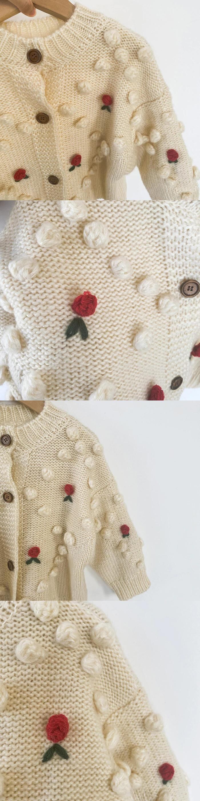オータムウィンターFlowerデザイン ニットカーディガンコート ウールトップス 秋物 冬物 キッズ フラワーデザイン mi5347049843971