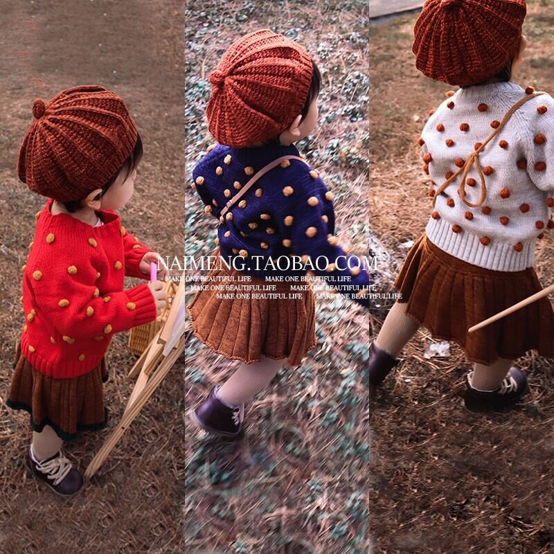 色:ベージュのボールセーター,青いボールセーター,赤いボールセーター,ワインレッドトップ,グリーンエッジのキャラメルニットキュロット,キャラメルニットキュロット,赤いボールイヤーキャップ,茶色の耳栓,ブラウンベレット