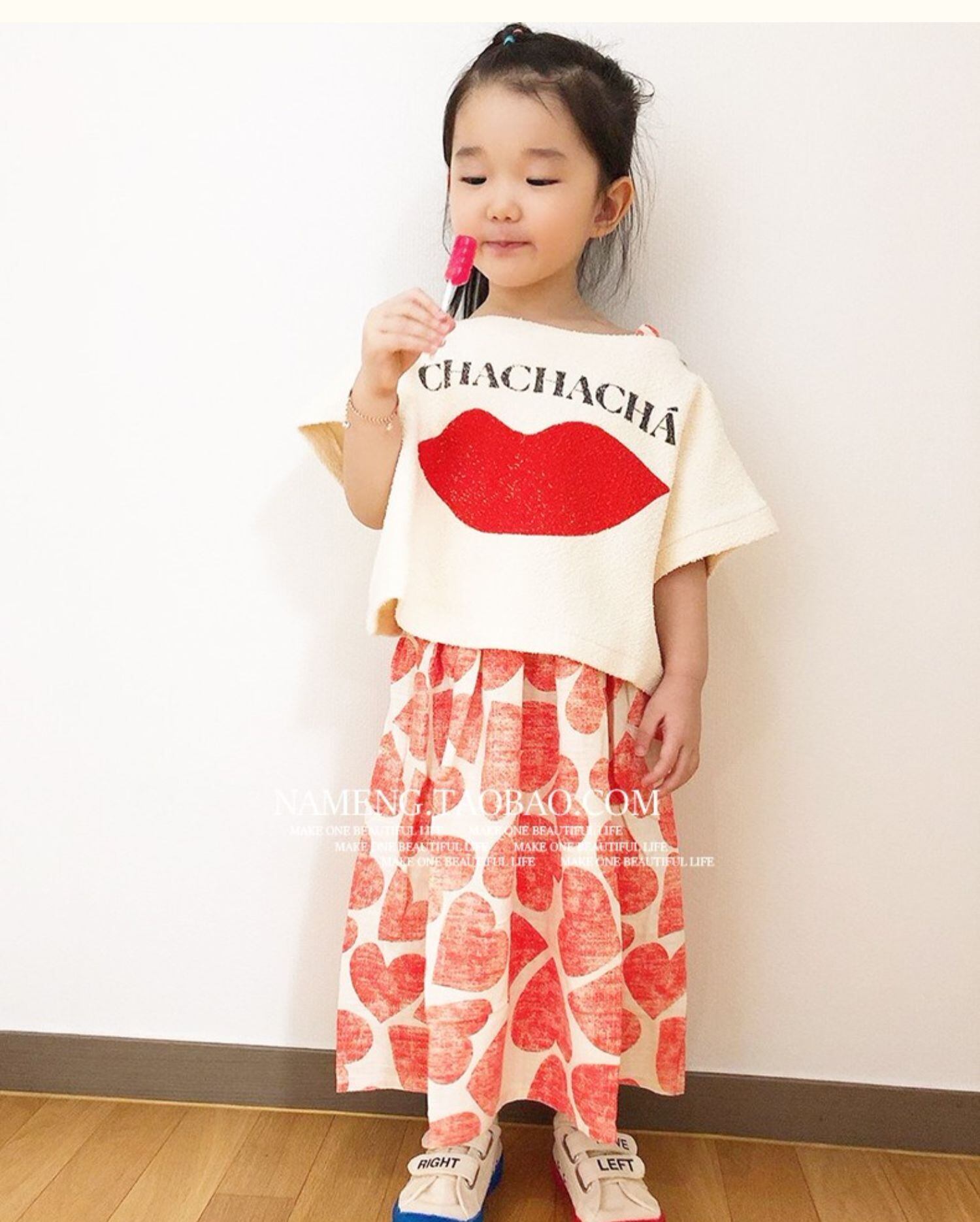 色:赤い唇のトップ,赤い愛のサスペンダードレス,デニムマイクロフレアパンツ