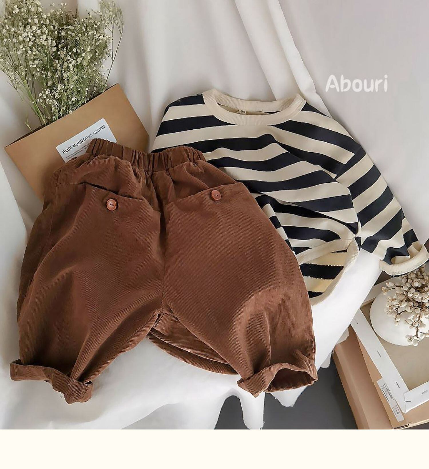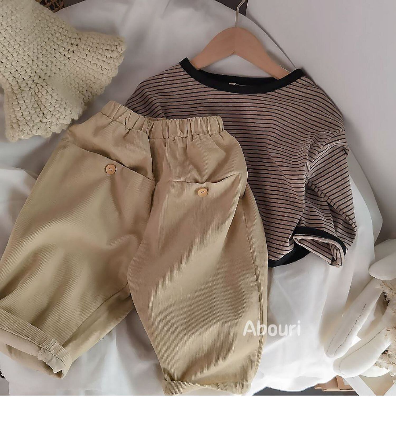 色:オレンジストライプのスウェットシャツ--V,黒のストライプのセーター--V,ベージュのボタン付きカジュアルパンツ,Ceeカラーボタンカジュアルパンツ