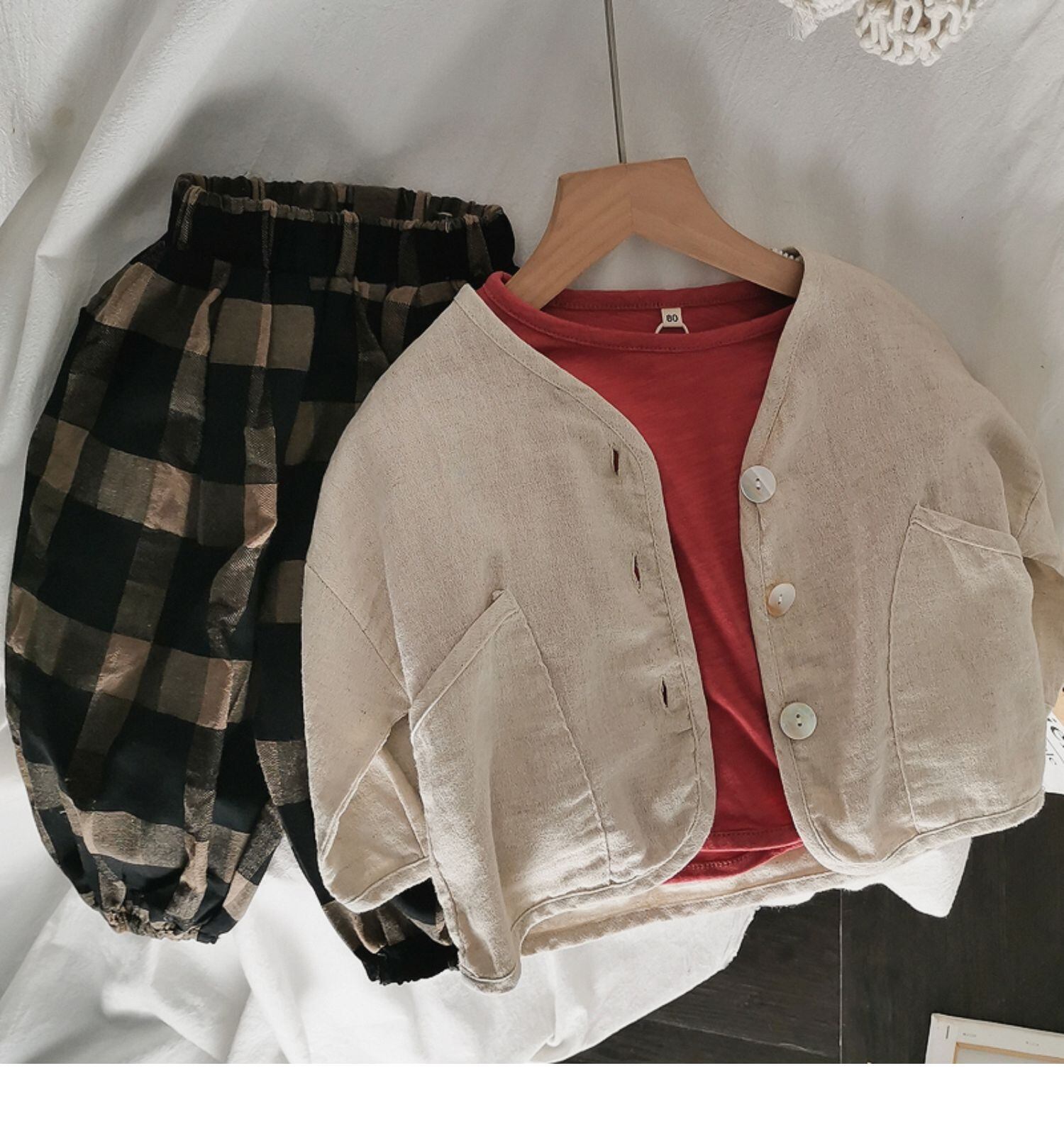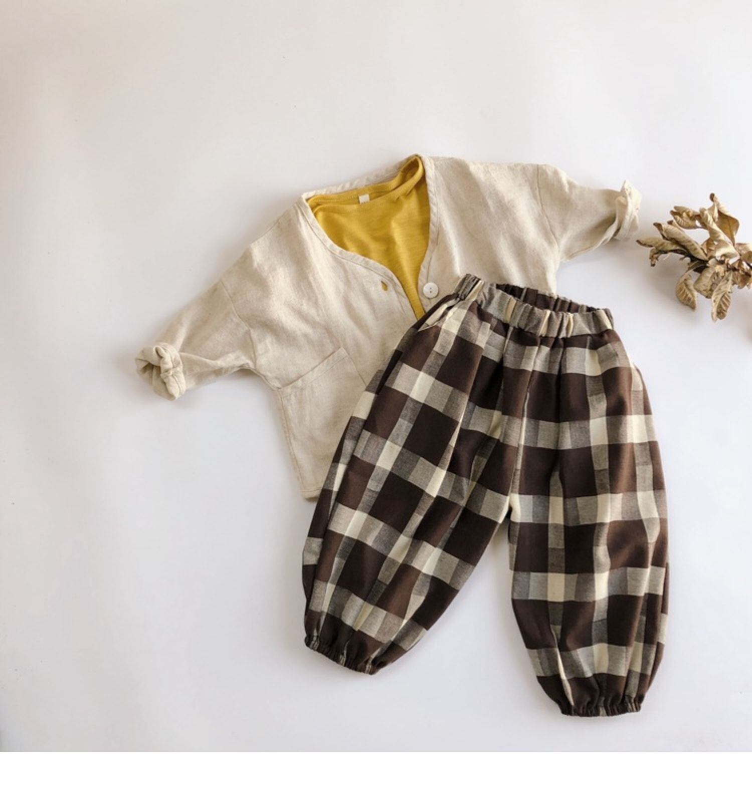 色:水玉のコットンとリネンのカーディガン--U,原色のコットンとリネンのカーディガン--U,温かみのある黄色いキャンディー半袖T,栗チェックパンツ