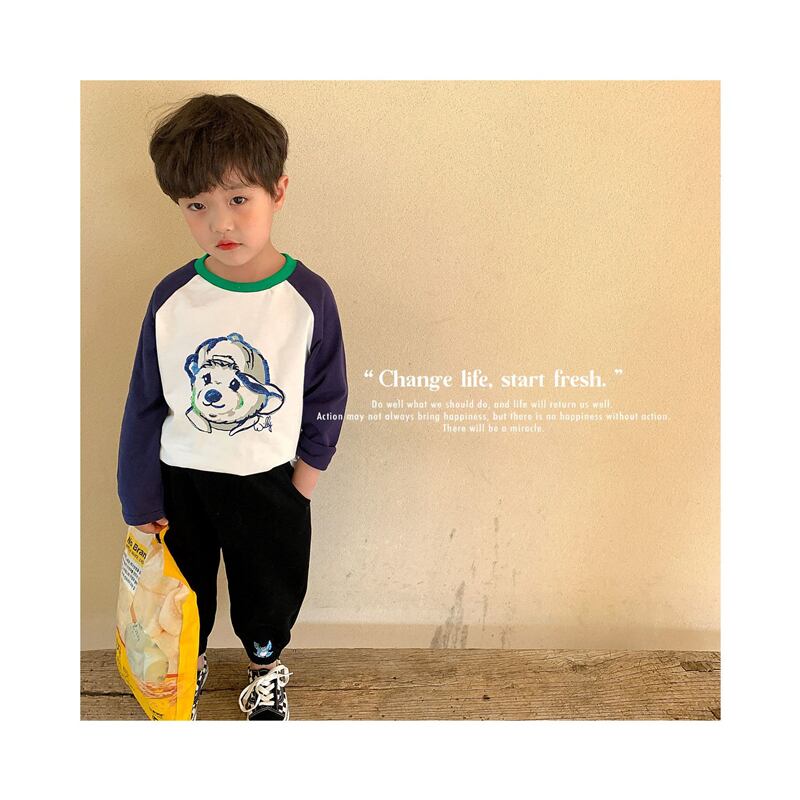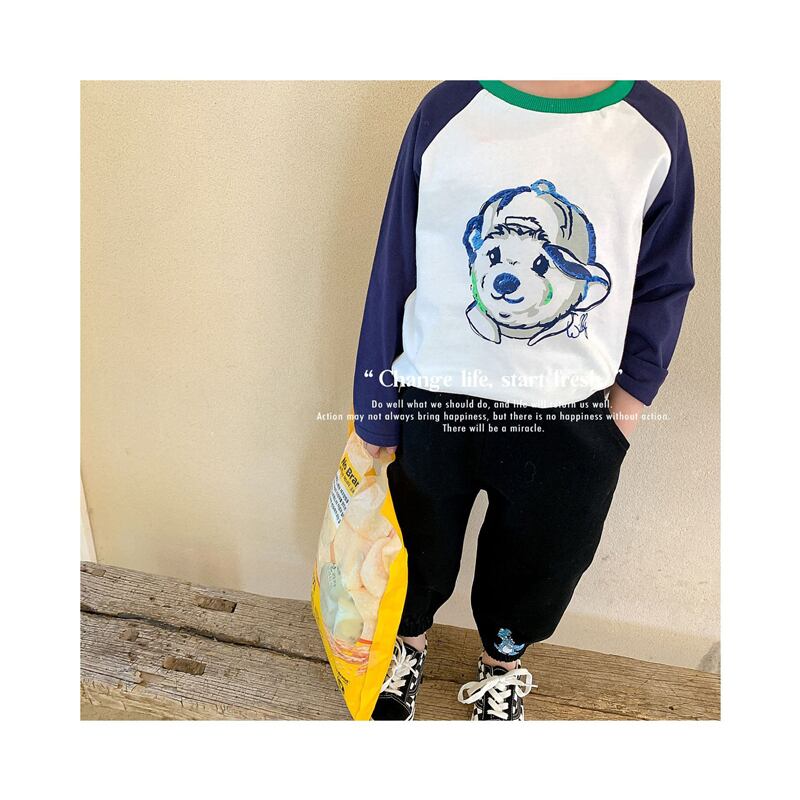 色:青と緑のテディベア長袖Tシャツ