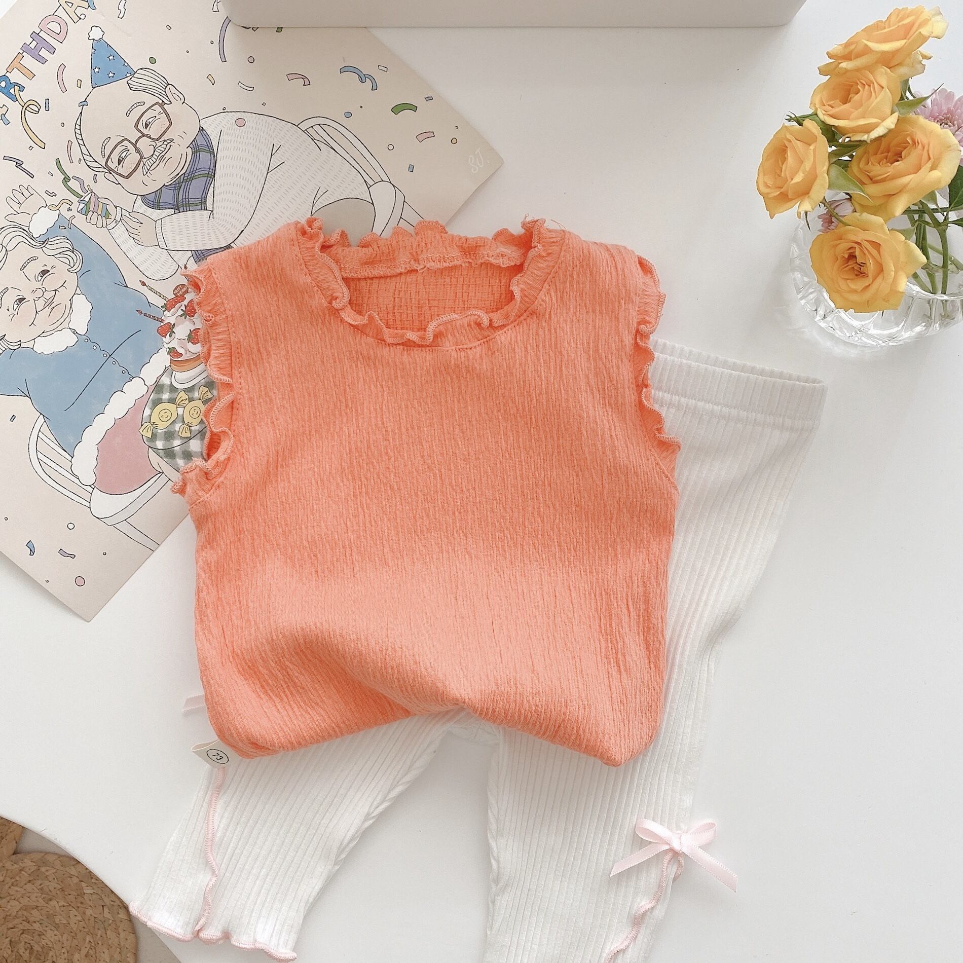 色:パープルベスト,オレンジ色のベスト,白いベスト,ピンクのベスト,白いレギンス,ピンクのレギンス,グレーのレギンス