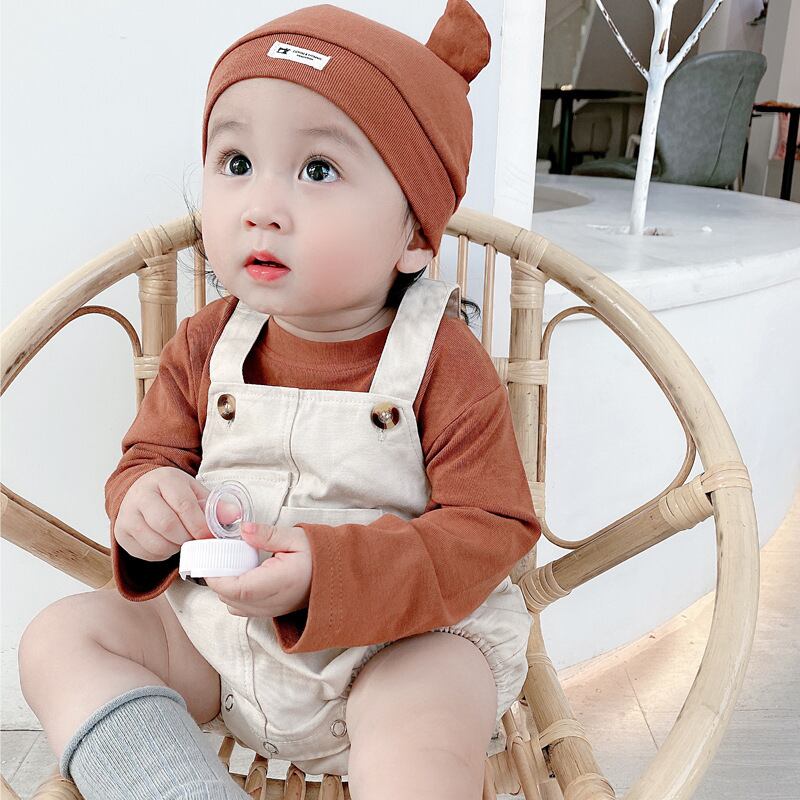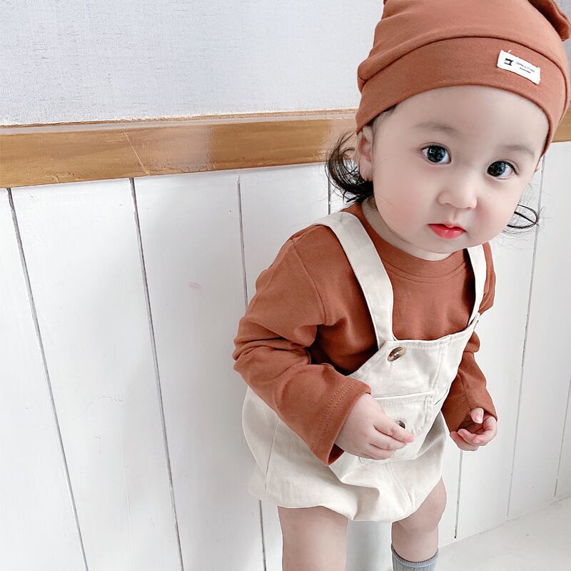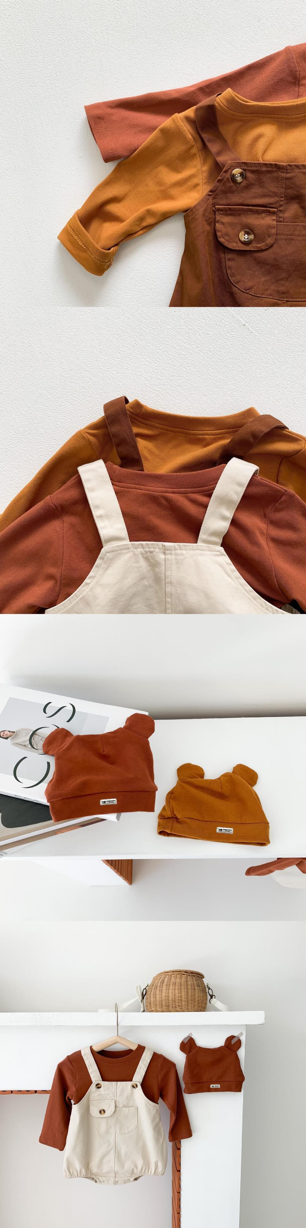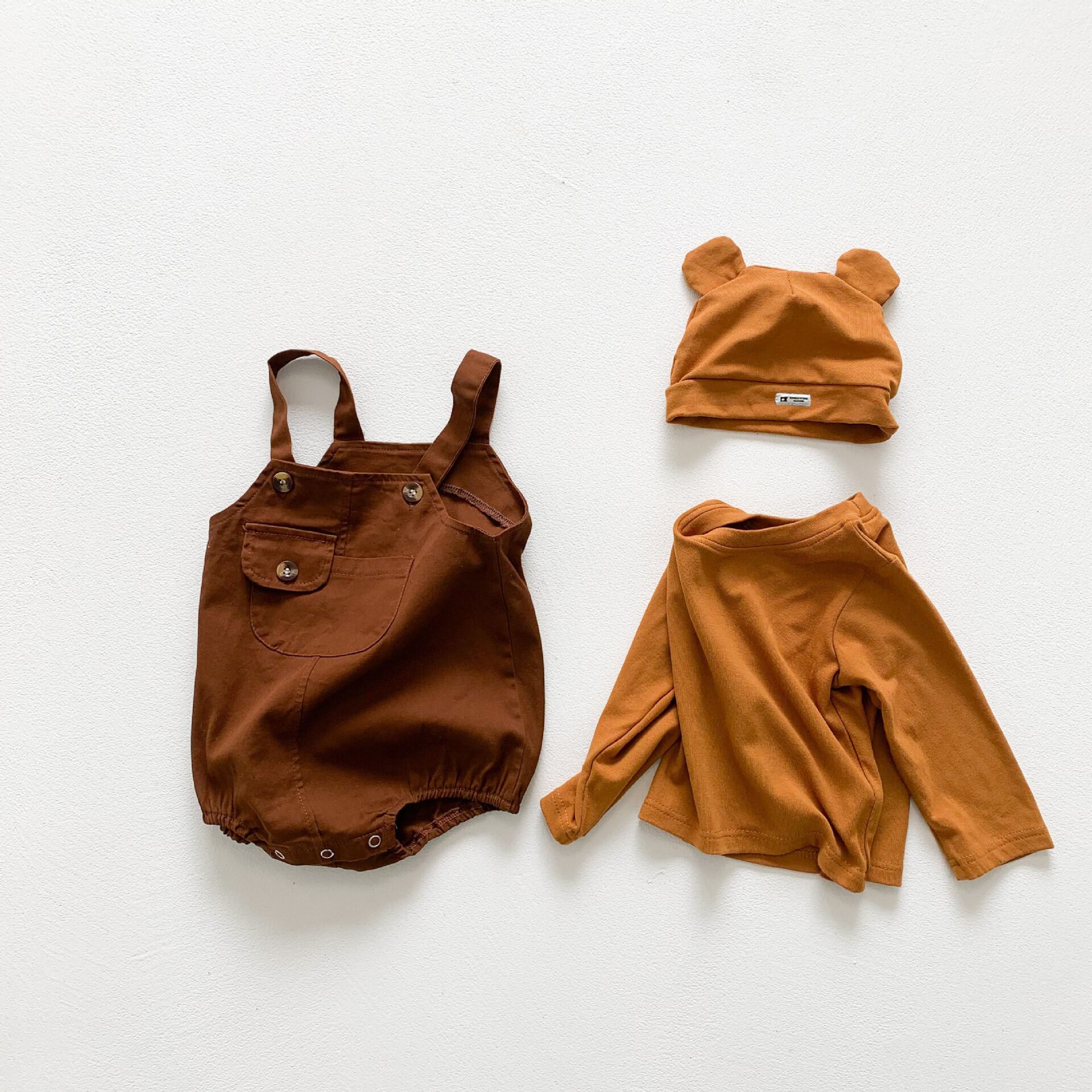 色:ブラウンレッドのボトミングシャツ+帽子,ダークカーキベースシャツ+帽子,アプリコットビブ,ブラウンのオーバーオール,アプリコットスーツ,茶色のスーツ