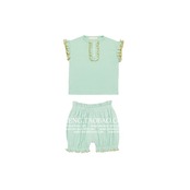 色:イエロースカーフトップ,ピンクのスカーフトップ,グリーンスカーフトップ,イエロードレープレースTシャツ,ピンクドレープレースTシャツ,グリーンドレープレースTシャツ,赤いスカーフトップ,黄色い菌ショーツ,ピンク菌ショーツ,グリーンファンガスショーツ,赤菌ショーツ
