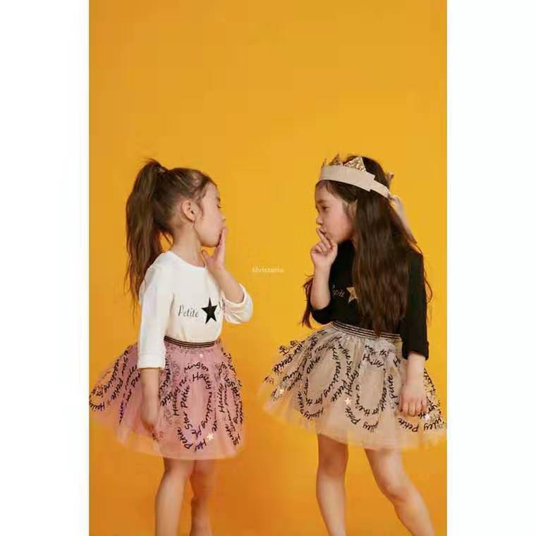 色:白い長袖T,黒の長袖T,ホワイトT+ピンクスカート,ブラックT+ゴールドスカート,カスタムメイドのグレーのスカート