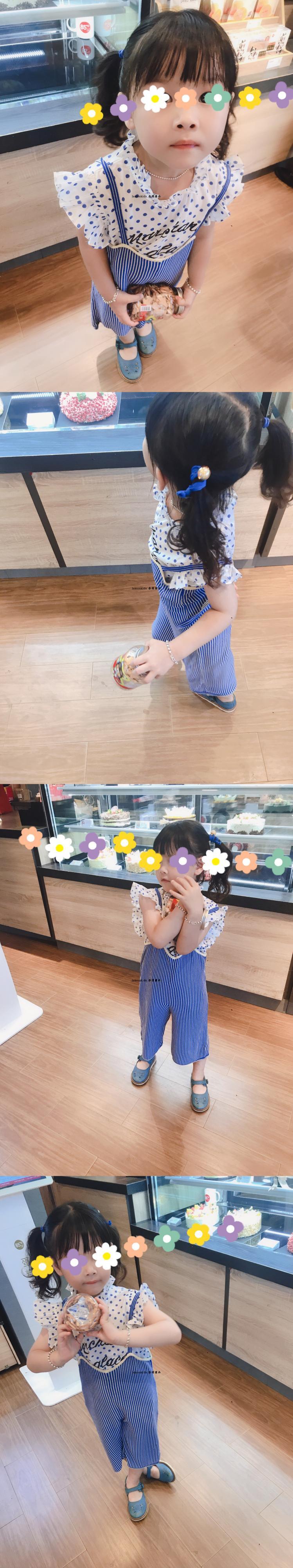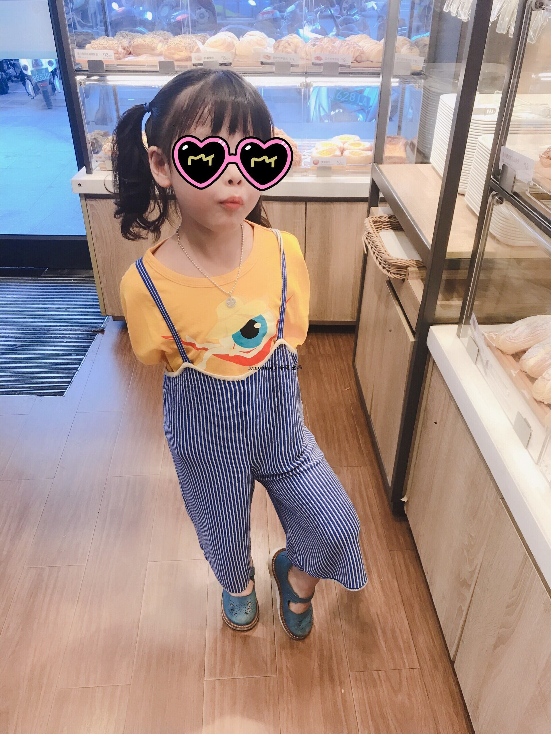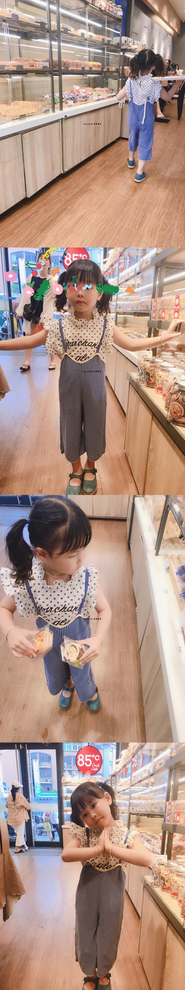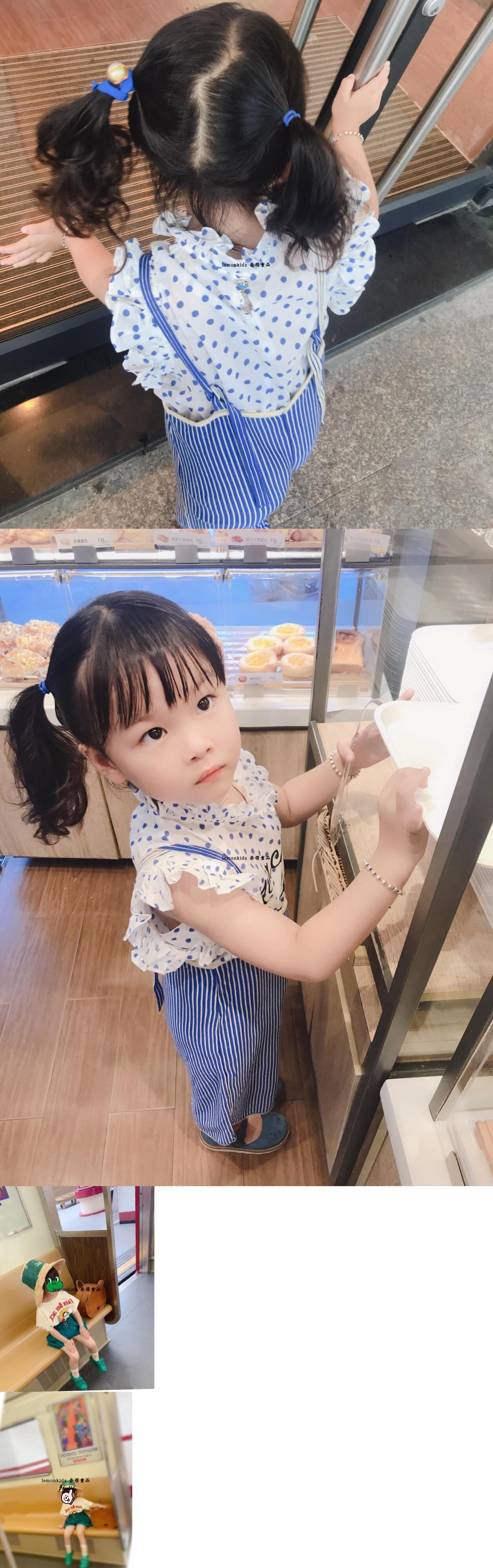 色:ブルーのストライプのサスペンダー,ブルー水玉文字プリントレーストップ,黄色い目の男性のTシャツ,ベージュの羊のTシャツを持っています