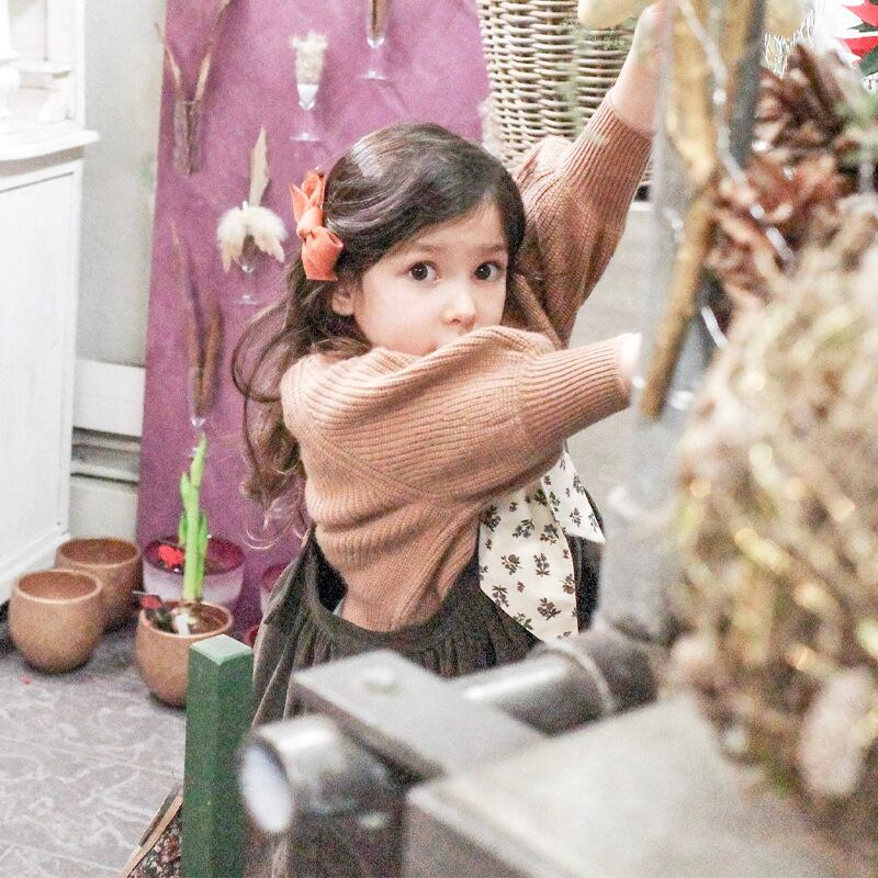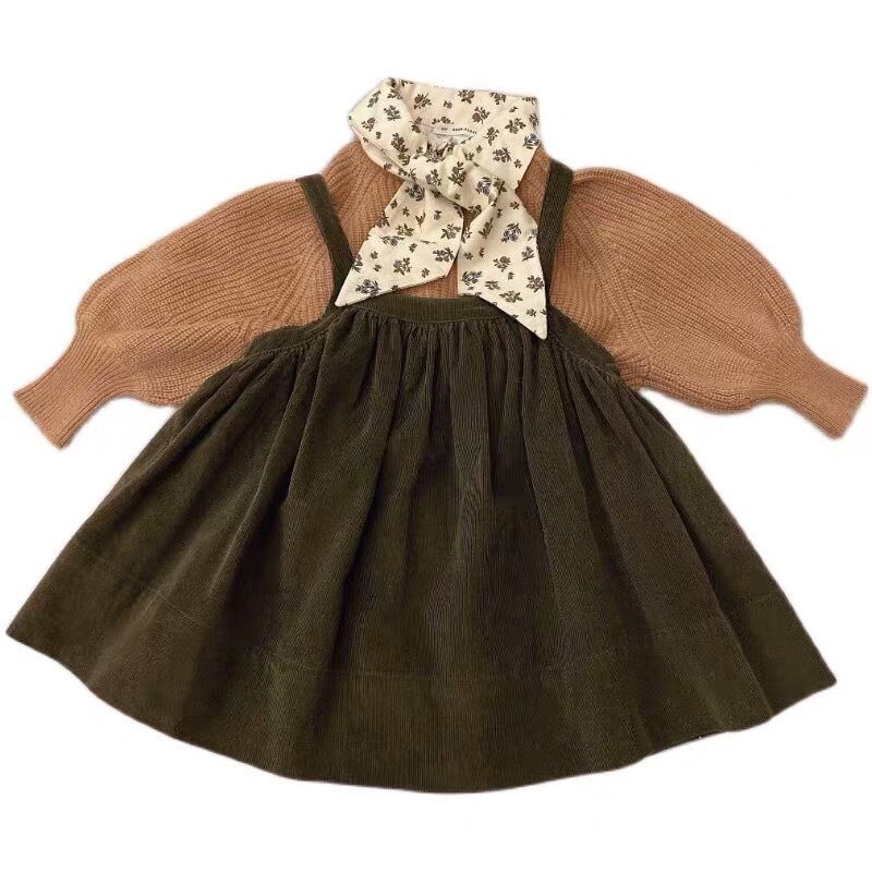 色:キャメルカシミアセーター,ピクルスグリーンストラップドレス,ベージュプリントの蝶ネクタイシャツ