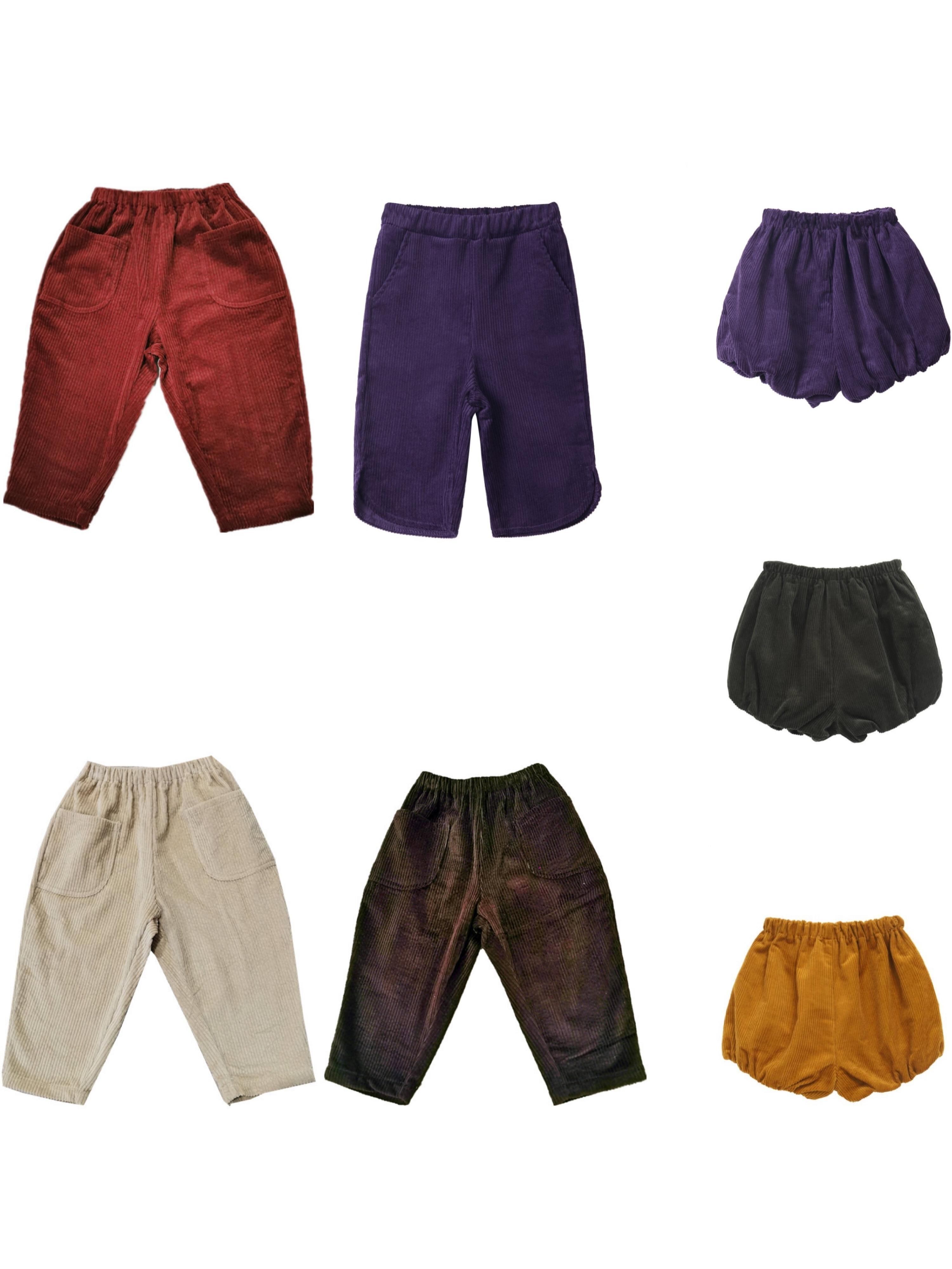 色:アーミーグリーンバッドショーツ,ベージュのコーデュロイパンツ,パープルスリットパンツ,パープルバッドショーツ,イエローバッドショーツ,ブルゴーニュコーデュロイパンツ