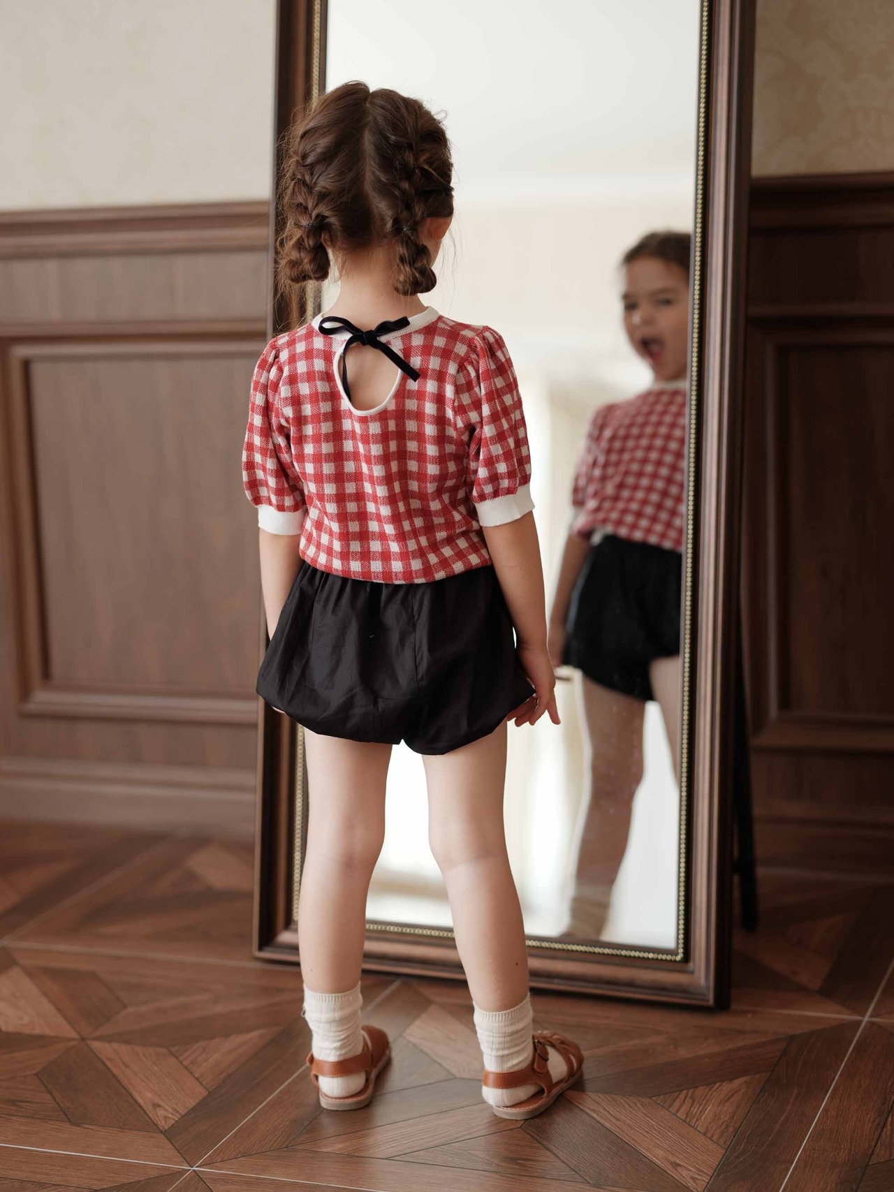 色:カーマインレッドチェック柄半袖先行販売は4月上旬に発行されます,黒のつぼみパンツスポット,ブラックフラワーバッドパンツの先行販売は3月末に発売されます