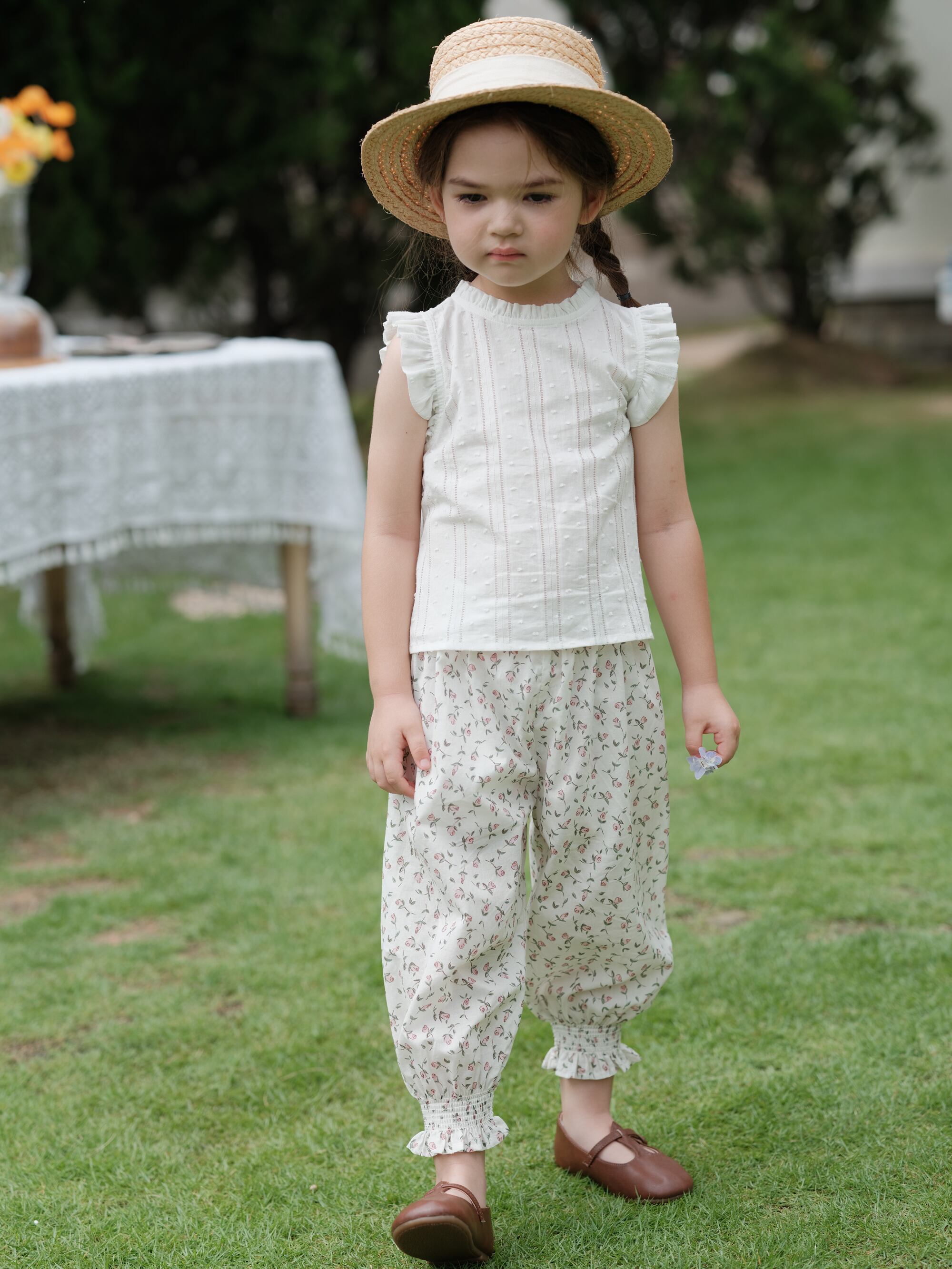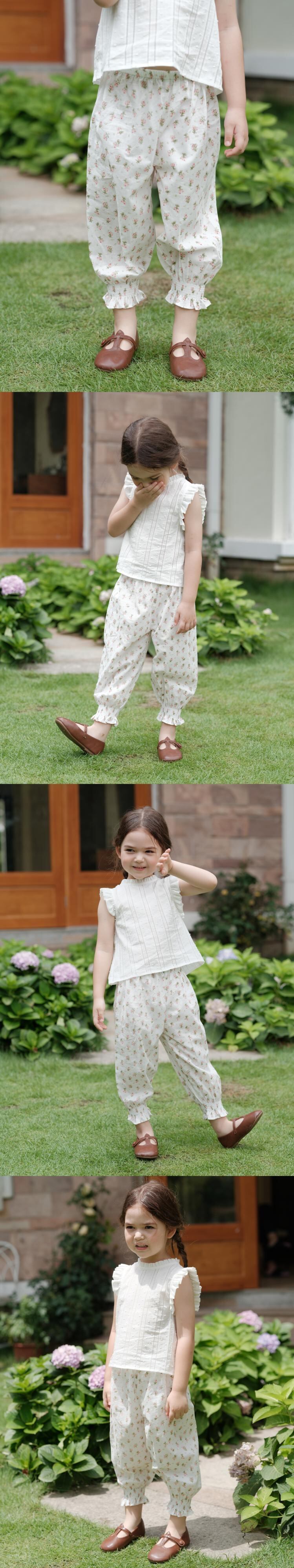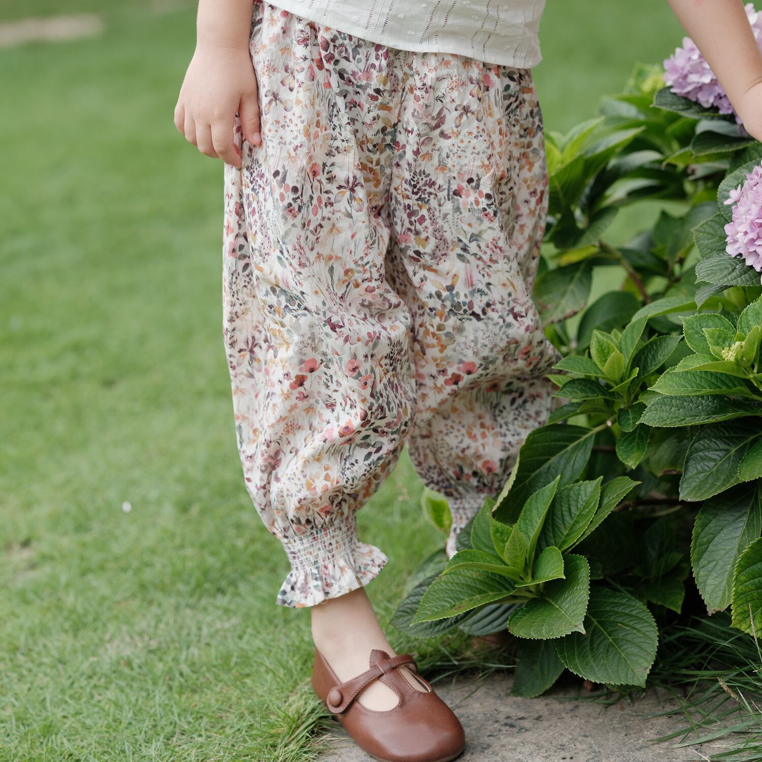 色:ピンクローズアンチモスキートパンツスポット,3月25日発売のローズマナーモスキートパンツ先行販売,レトロなフローラルアンチモスキートパンツスポット,モデルはサイズ110の蚊よけパンツを着用し、高さは110cmです