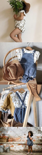 色:黄色の花柄ロンパーススポット,3色フローラルロンパーススポット,トランペットオーバーオールスポット,デニムブルーのオーバーオール在庫あり