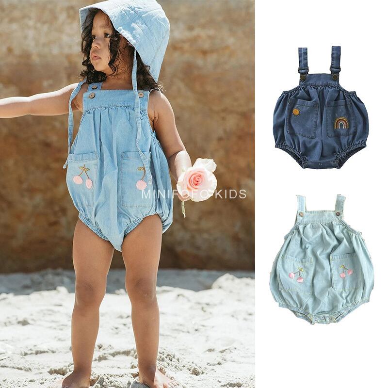 色:ライトブルーの薄手のデニムチェリーオーバーオール,ダークブルーの薄手のデニムレインボーオーバーオール
