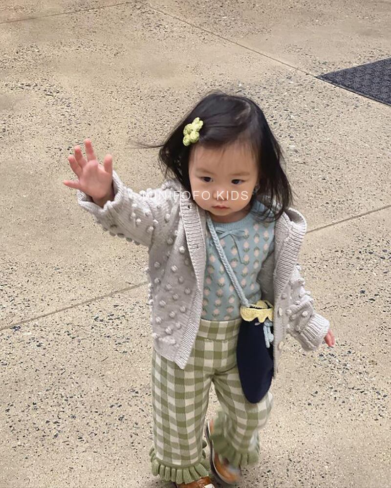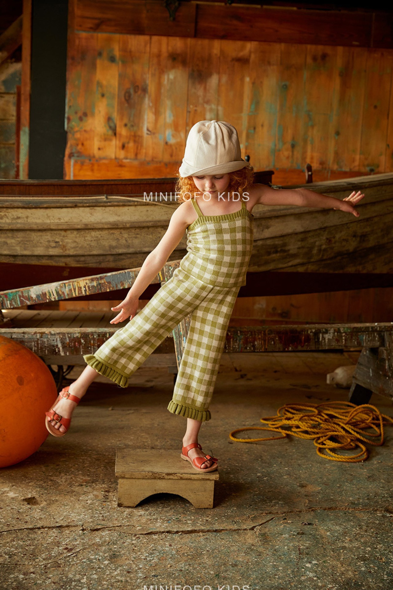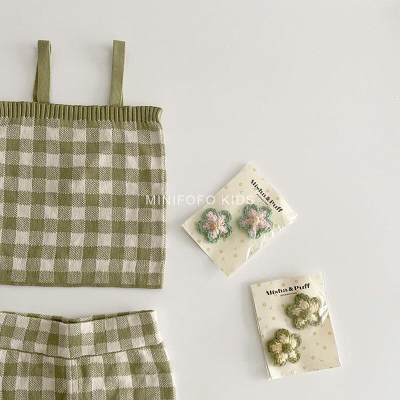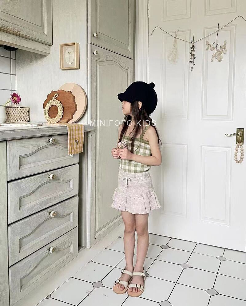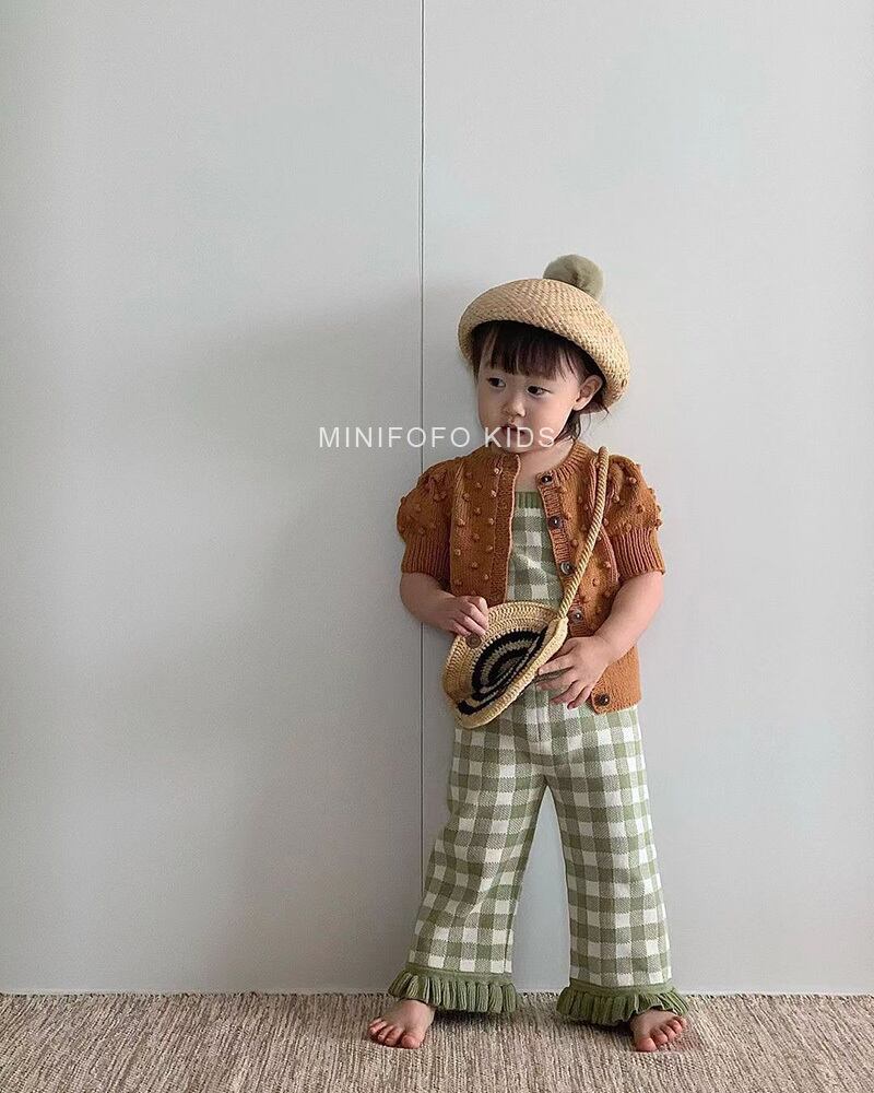 サマー薄手ニットグリーン格子柄トップス ワイドレッグパンツ レース 夏物 ワイドパンツ 4/12 春夏 SS 子供服 韓国風 mi5339154462461